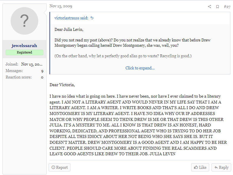 Now, this isn’t an uncommon occurrence on AW, where discussion of marginal agents and publishers often spurs the emergence of sockpuppets, who not infrequently turn out to be the agents or publishers themselves, posting under aliases. But this sockpuppet event was especially amusing, because not only was the sockpuppet posting from Drew’s IP address, she was using Drew’s previous name. That’s right: To defend herself against criticism, fake agent Drew Montgomery chose to present herself as fake client Julia Levin–despite the fact that, six posts up, I’d provided a complete account of her exploits under that name.
