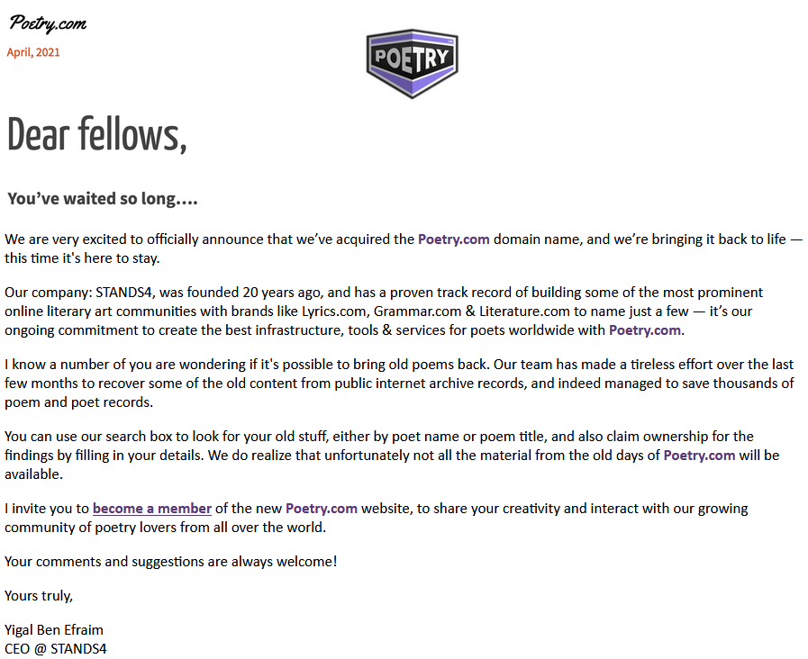 Former Poetry.com participants found out about the change via an email solicitation at the end of March, inviting them to “claim” their poems on the re-launched Poetry.com website and “share your message with the world!”