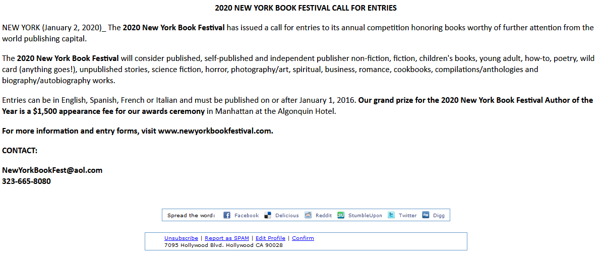 Yes, I thought there were a few too many mistakes there! Anyway, I just "won" in the Nature/Animals category of the Great Southwest Book Festival. I wrote and asked if I would be receiving any free stickers or anything else that was free. Haven't heard back – no surprise. I was researching around to see if this was an award worth proclaiming on my second book, so I'm glad I found this blog. I won't bother to mention the award, and certainly won't ever enter this guys contests again. Thanks for your information and opinions.