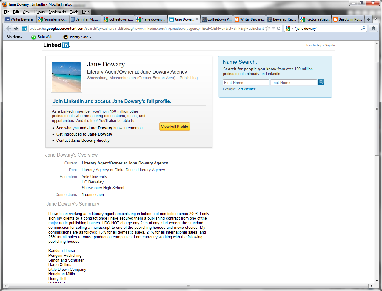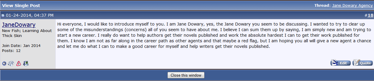 Enter Jane Dowary, of the Jane Dowary Agency. I first started hearing about Jane in April of 2012, from writers whose work she’d submitted inappropriately or to whom she’d given bizarre writing advice. In at least one case, I’m convinced, she fabricated an editor’s comments.
