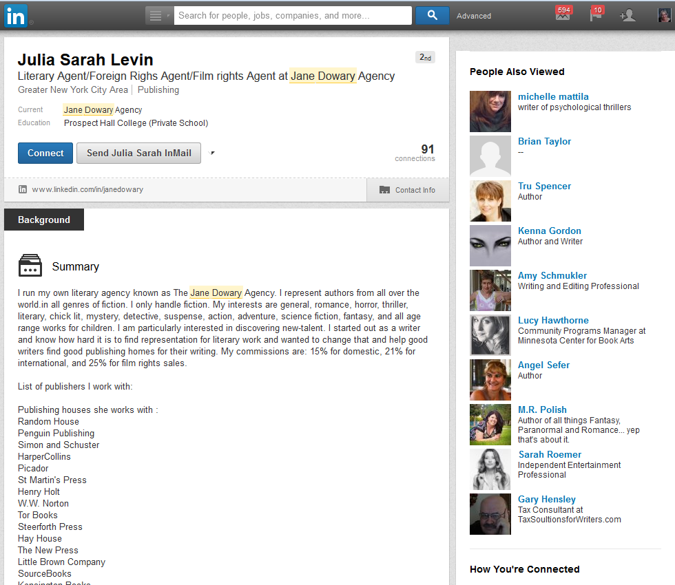 3. Yes, it's Easter Sunday, and I just received a LinkedIn request from "Julia Sarah Levin" at the Jane Dowary Agency. She's been a busy bunny this weekend. Thankfully, I read the many informative posts about this so-called agent prior to making the mistake of accepting her request. I belong to an indie publishing collective. Julia appears to have targeted the 17 authors on our roster. As a board member for the Northwest Independent Writers Assoc., I will spread the word of warning. But all you have to do is read the nonsensical ramblings on her website to know that she can't write, never mind dare to deem herself qualified to evaluate the work of others.