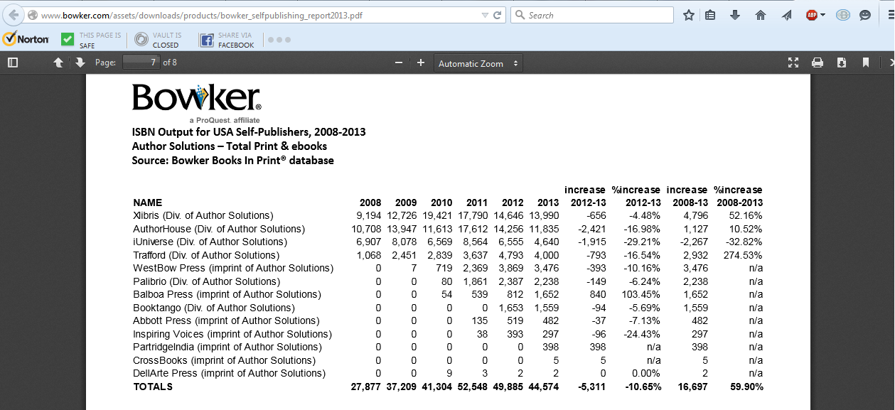 We’ll have to wait for 2014 stats to know whether this trend will continue, but my guess is that it will. In part, ASI is reaping the fruits of its poor reputation and the large amount of negative publicity and commentary it has received in the past few years (see, for instance, David Gaughran’s The Case Against Author Solutions). Beyond that, though, I think that its business model–print-centric, high-priced, with outsourced operations (much of ASI is based in the Philippines) and an extreme emphasis on upselling–is simply becoming less and less relevant in this age of free-to-cheap digital self-publishing solutions.***