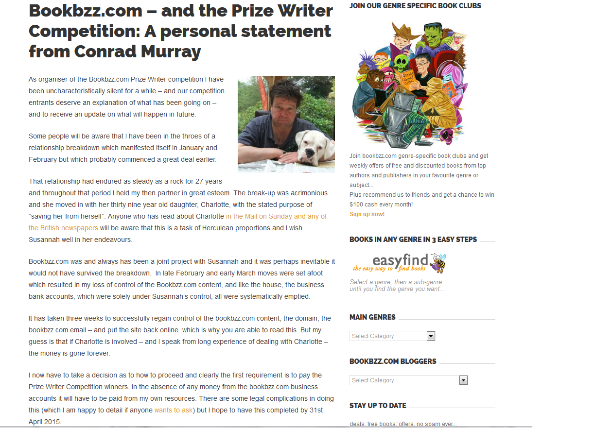 UPDATE, 4/4/15: Murray has posted a rambling statement on the Bookbzz site, claiming that he has “lost control of Bookbzz content”, that “the business accounts were systematically emptied,” and that “In the absence of any money from the bookbzz.com business accounts [prizes] will have to be paid from my own resources,” a task he “hopes to have completed” by the end of April. A screenshot is below, in case the statement disappears.