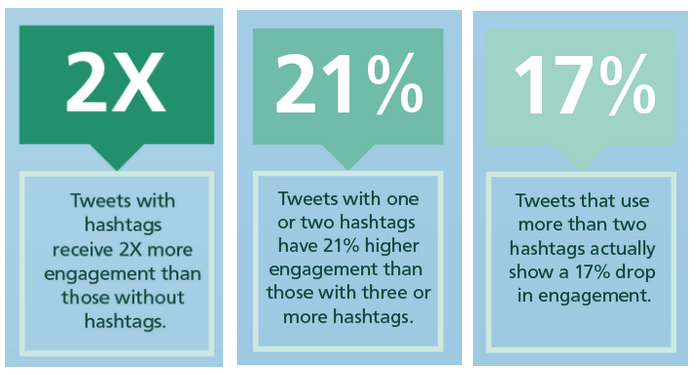 In 2014 Buffer, another reliable social media research company, published data that showed that after two hashtags, engagement of a post actually goes down (graphic courtesy of Buffer).
