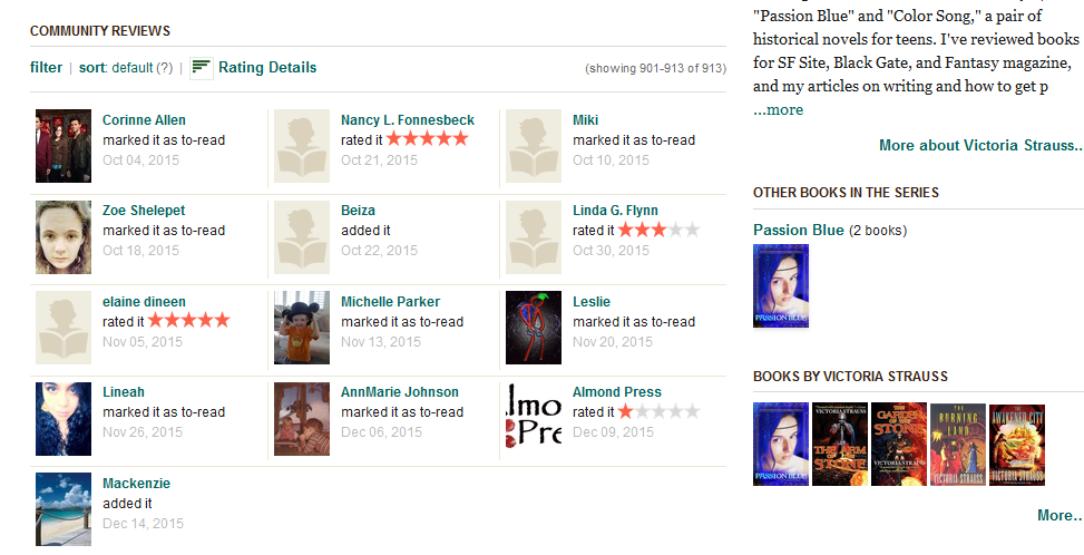 I contacted Goodreads, which told me that everyone is entitled to an opinion–which is certainly true, if it’s actually an opinion and not a childish attempt at retaliation. So it would appear that Almond’s revenge-ratings are there to stay. Not that big of a deal, really–unless, of course, you think that publishers should respond to criticism in a forthright and professional manner.
