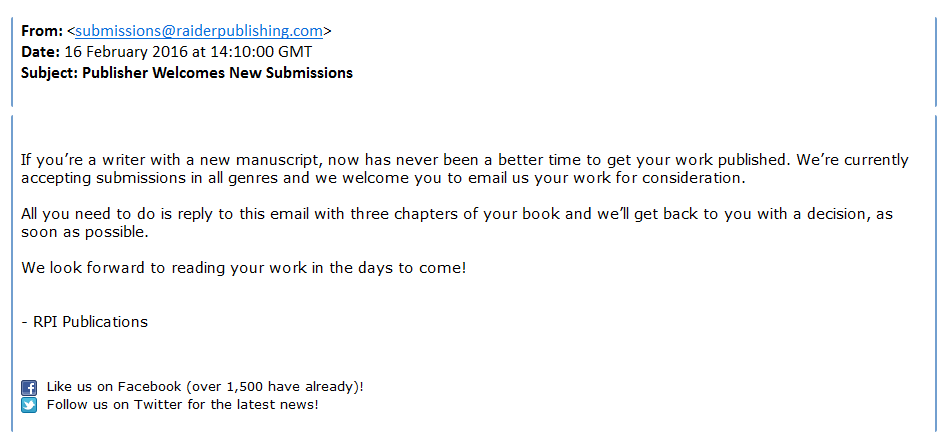 I know this thanks to an alert Writer Beware reader, who forwarded Raider/RPI’s solicitation email: