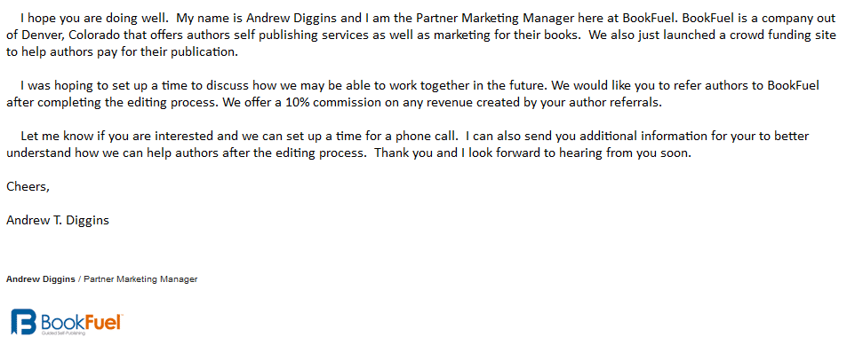 Like any self-pub service provider, Bookfuel wants customers, and one of the way it apparently hopes to get them is by referral. To sweeten the deal, it’s offering something many people find hard to resist: a kickback. A freelance editor forwarded me this solicitation she received: