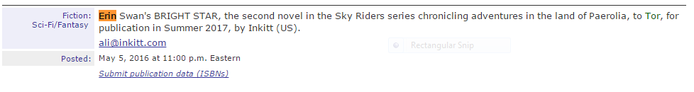 Per the Grand Novel Contest guidelines, Inkitt appears to be claiming an agent’s 15% commission. On Inkitt, Swan’s work appears to be a series, and Bright Star is actually Book 2, so it’s not clear to me whether Tor has bought the series or just the one book.