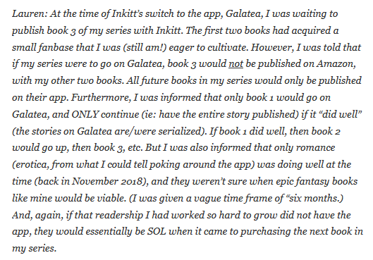 UPDATE 6/16/22: As suggested by the interview linked in above, Inkitt seems to be focusing most of its effort on the Galatea app. I’ve recently seen a Galatea non-exclusive contract (“Inkitt Originals Publishing Agreement”), and it has some issues, including a sweeping claim on successor books, an editing clause that allows Inkitt to edit “at its sole discretion” (presumably because books may need to be adapted to the Galatea platform), and really confusing royalty language.