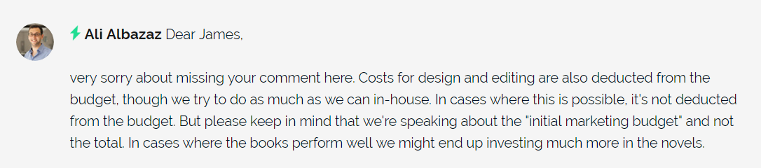 – Royalties for Inkitt-published books are 25% of net (a drop from the 50% initially promised). (Clause X.) Inkitt also promises to “allocate a minimum of six thousand (6,000) dollars marketing budget into the Work for an initial marketing test”. (Clause VIII.2.) Authors should be aware that editing and design costs are considered part of this budget, per a post from Inkitt founder Ali Albazaz in this discussion thread.