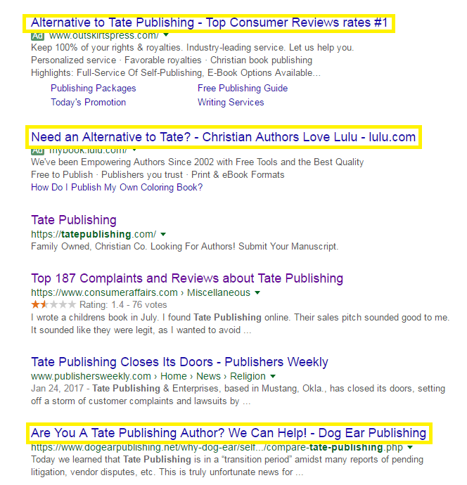 http://www.thelostogle.com/2016/09/22/tate-publishing-is-being-investigated-by-the-department-of-labor/http://kfor.com/2016/06/08/oklahoma-christian-publishing-company-accused-of-not-paying-1-7-million-in-bills-owner-will-file-countersuit/https://www.consumeraffairs.com/misc/tate_publishing.html