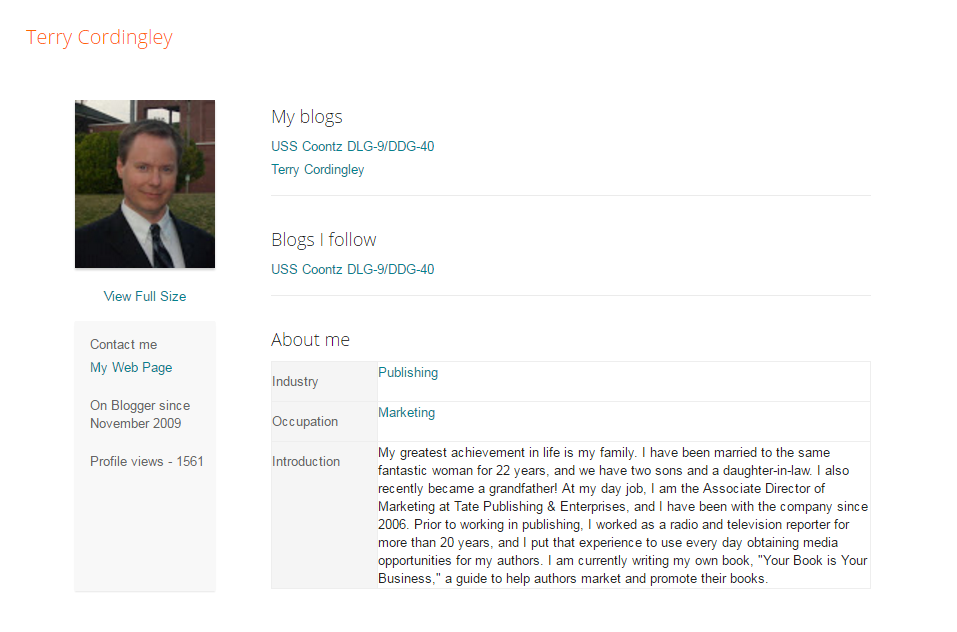 As many Tate authors know, Tate’s Marketing Director is Terry Cordingley. Here’s a screenshot, taken today, of the Mr. Cordingley’s Blogger profile; it identifies him as Tate’s Associate Director of Marketing, a position he says he’s held since 2006: