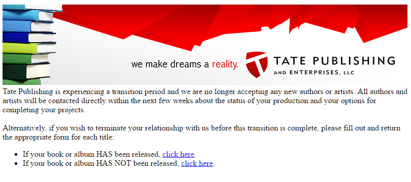 ANOTHER UPDATE, 1/19/17: Tate’s website now claims that it’s “experiencing a transition period.” There are links to click; if you do, you’re taken to a release form requiring you to release Tate from legal liability and from providing “any refund or monetary compensation whatever.” For authors whose books have already been published, there’s the option of paying (!!!) a $50 “processing fee” to get final book-ready files.