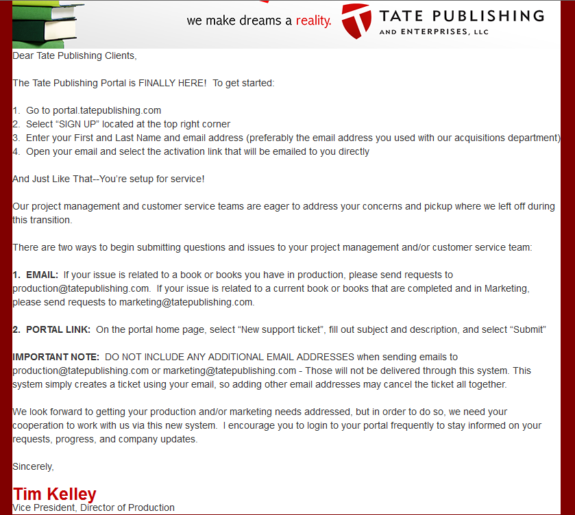 UPDATE 1/14/17: Some Tate authors report receiving an email signed by Tate’s Director of Production, Tim Kelley, claiming that Ryan Tate hasn’t paid employees and “your book will never be finished.” This email was reportedly followed, within a couple of days, by another email claiming that the first email was the result of “identity theft” and its allegations aren’t true.