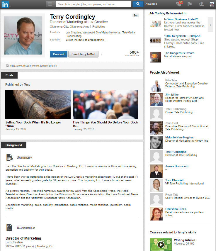 UPDATES 1/21/17: Terry Cordingley has deleted his Blogger profile and changed his LinkedIn profile. “I previously worked for Lux Creative Concepts as the Director of Marketing, assisting authors with marketing, promotion and publicity for their books. Prior to joining Lux, previously operating as Tate Publishing LLC…” (my bolding)