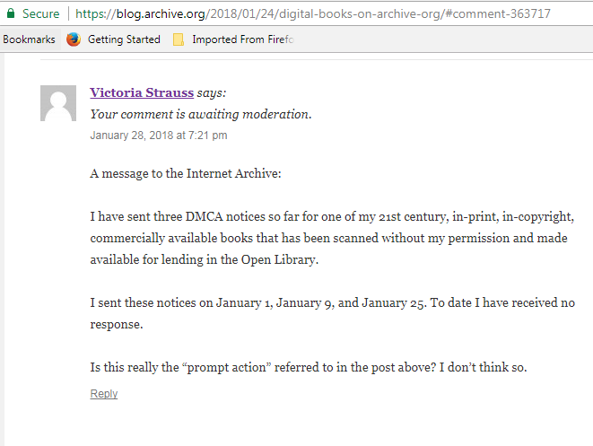 Then, on January 27, author Virginia Anderson alerted me to her blog post about her experience with Open Library and the IA. Like me, she’d found one of her books available, had sent DMCA notices, and had heard nothing back. Frustrated, she posted a comment on the IA blog, indicating that she’d be seeking legal advice if she didn’t get a reply (the IA blog is moderated, and Ms. Anderson’s comment never appeared publicly). Within 36 hours, the IA responded in email, and the digitized versions of her book were taken down.