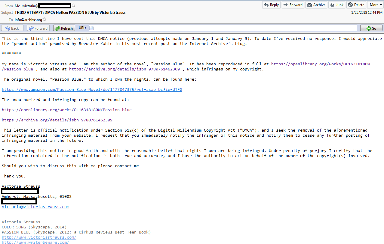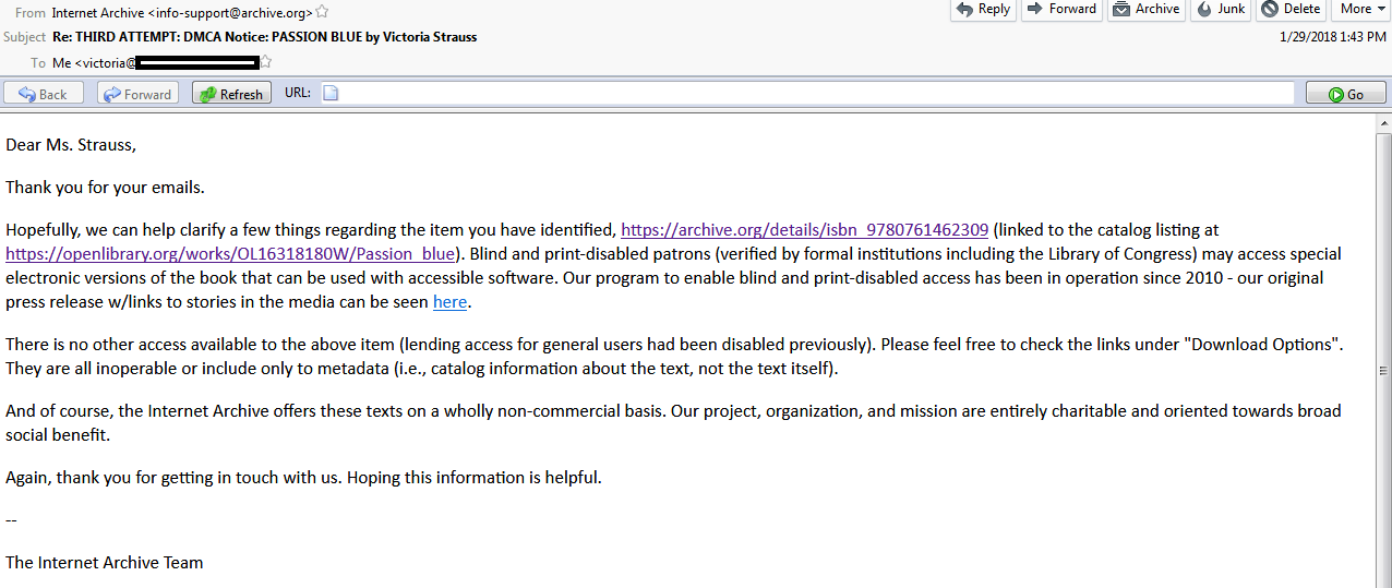One of the questions that has concerned SFWA and other writers’ groups is how the IA responds to DMCA notices. So on January 1, I sent one for Passion Blue.