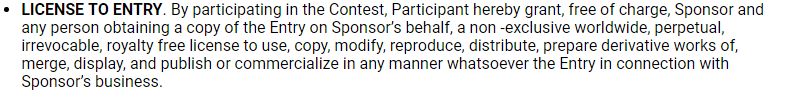 "By participating in the Contest, Participant hereby grant, free of charge, Sponsor and any person obtaining a copy of the Entry on Sponsor’s behalf, a non -exclusive worldwide, perpetual, irrevocable, royalty free license to use, copy, modify, reproduce, distribute, prepare derivative works of, merge, display, and publish or commercialize in any manner whatsoever the Entry in connection with Sponsor’s business."
