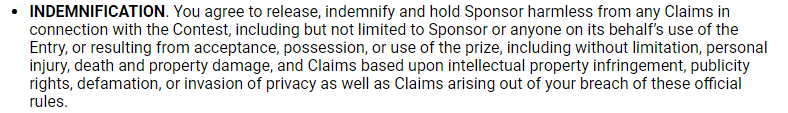 In addition, entrants must agree to a sweeping indemnification clause whose language suggests they will have no recourse for improper use of their stories (such as intellectual property theft):