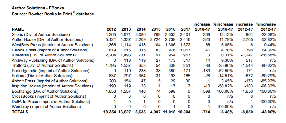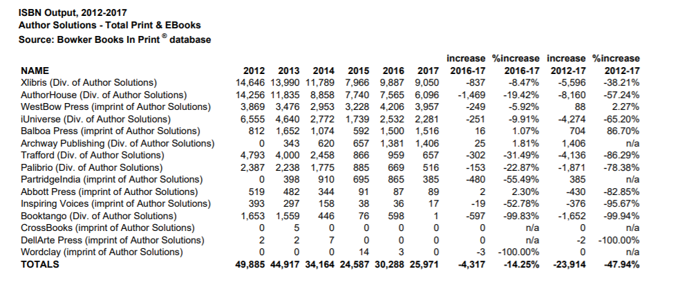 In the latest version of Bowker’s report, that slide continues. 2016 did see a small post-Najafi uptick, from 24,587 to 30,288; but in 2017 the freefall resumed, with ISBNs dropping to 25,971–just slightly above 2015’s output. A few of the individual imprints do show negligible increases, but for the most part they all go down (by four figures in the case of AuthorHouse).
