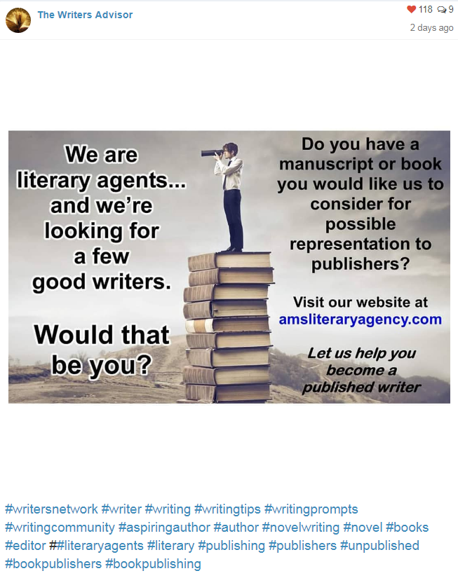An emphasis on new and unpublished writers. An agency that’s actively recruiting new and unpublished writers may be doing so because they are easier to bamboozle.