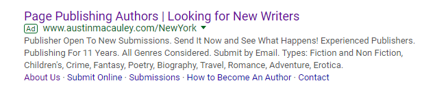 AM is currently recruiting writers via deceptively-headlined Google ads, which encourage authors who use certain search phrases to believe they are submitting to a Big 5 publisher: