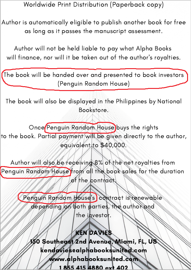 And here is the pack of lies. Well, pretty much everything the scammers offer is a lie, but these are mostly slant lies: they could be true (it’s just that they aren’t). Alpha Books, on the other hand, distinguishes itself by going well beyond the usual obfuscations and half-truths with a great big alternative fact: guess what, we have access to Penguin Random House! Which will pay you $40,000!