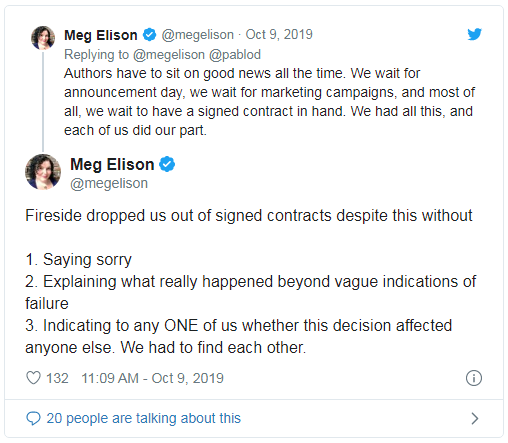 A few days later, Defendini issued an apology. “I can see now how [the cancellation emails] read as callous, uncaring, and dismissive of the authors’ feelings,” he wrote. “I’m very sorry for that….My behavior was not consistent with Fireside’s values, and I deeply regret it.”