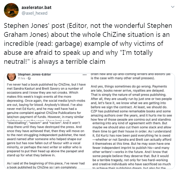Despite all of the above, there are still those who continue to defend CZP, and to brush off the statements by writers and staff. For example, this, from editor Stephen Jones (Jones’s post has been removed; this is a screenshot posted to Twitter):