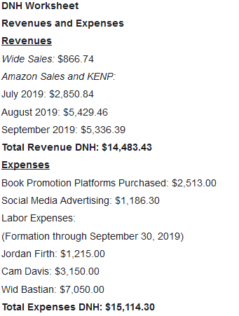 Equally troubling, why were there more than $15,000 in expenses–three-quarters of which were for “labor”–when the contract stipulated that expenses were not to exceed the total of the buy-in fees? According to Kairos, this wasn’t really an expense cap: “This provision was specifically and intentionally included in the contract language to avoid the possibility of a ‘cash call’ – Genius Media asking authors to contribute more to DNH Collab to achieve the goal of making USA Today Bestseller status. No ‘cash call’ was ever made in the DNH Collab.”