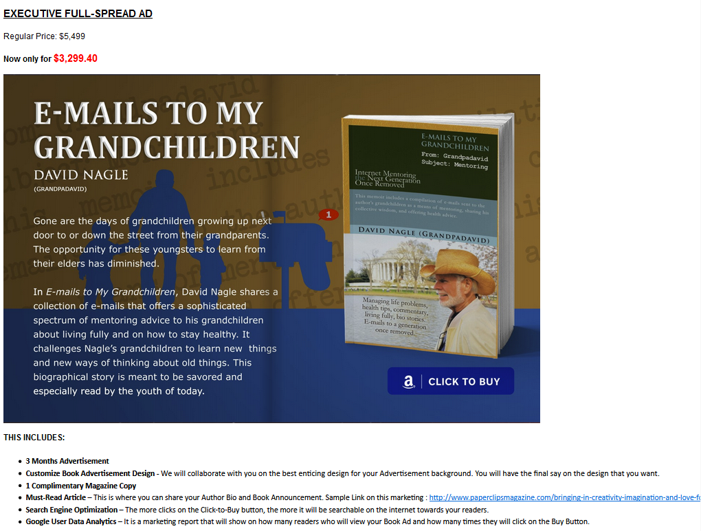 The prices the faux magazines charge for placement can be enormous. For instance, here’s the “Executive Full-Spread Ad” from Paperclips Magazine, which is owned by (not “partnered with” as claimed in its solicitation email) publishing and marketing scammer Legaia Books: