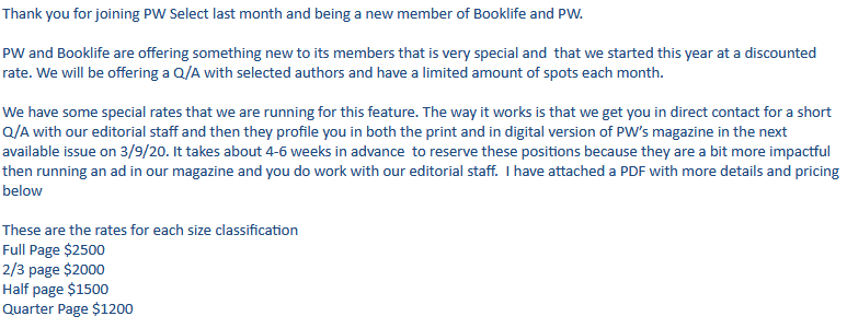 These prices rival the scammers’. And the promise of print exposure is not quite what it seems. Per PW’s Q&A explainer, the interviews appear not in the body of the magazine, but in “PW’s BookLife supplement, which is published the last week of each month bound into that week’s issue of Publishers Weekly“. In other words, easy for readers to ignore or skip over.