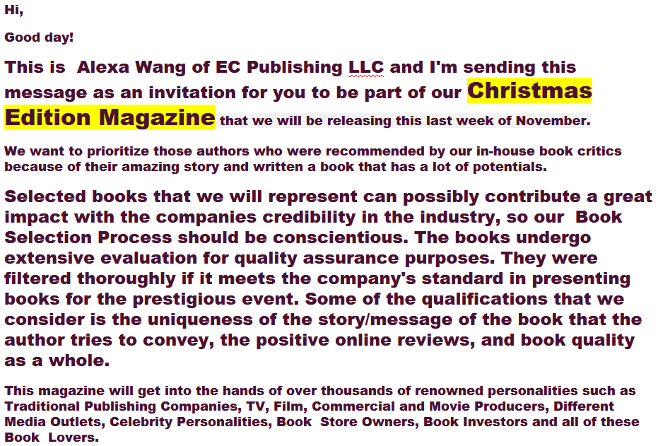 The Christmas magazine that’s the subject of EC Publishing’s solicitation can be seen here (if you’re brave, you can also check out the Las Vegas Edition, produced for the Las Vegas Book Festival). Like most of the pay-to-play magazines, it’s a compilation of author-purchased ads and features, laughably badly-written general interest articles, and a smattering of actual advertising. Prices for inclusion range from a few hundred to several thousand dollars, depending on how much space is purchased.