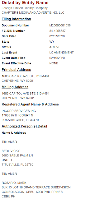 Chapters Media and Advertising has business registrations in several states, including Wyoming and Florida–though not in Nevada, where it purports to be located. It’s registered as a “foreign LLC”, and guess where officer Mark Rosario lives: