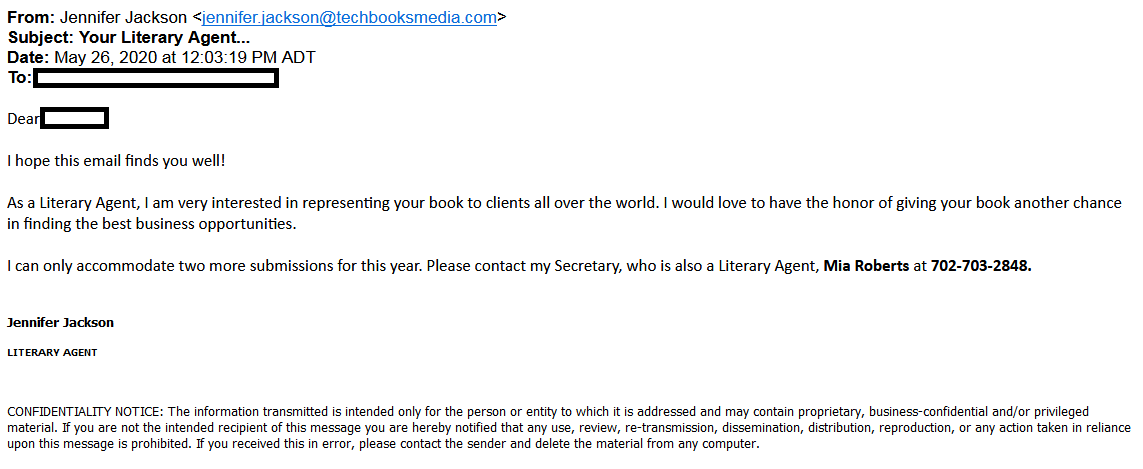 3. Use your common sense. Anyone can make an occasional typo, but professionals communicate professionally (no reputable agent would send out grammar-challenged emails like the ones from “Jennifer Jackson”). Check the email address and any links–do they match the person or company claiming to be contacting you? (There’s nothing to connect Ms. Jackson with anything called Techbooks Media.) If there’s a demand for upfront money, be sure it’s a service or company that customarily charges such fees (reputable agents and publishers don’t).