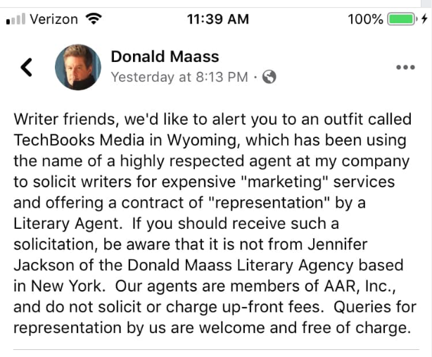 And sometimes the deception is more elaborate. Last week, Donald Maass of the Donald Maass Literary Agency posted this warning: