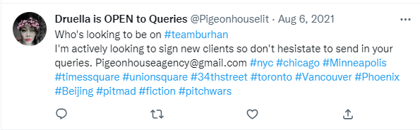 Pigeon House Literary Agency launched just this past February. It’s run by Druella Burhan, whose resume includes none (zero, zip) of the relevant background experience you typically want to see from a new literary agent–such as a professional writing resume, or having previously worked for a reputable agency or publisher.