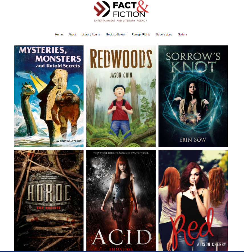 When I looked at Fact & Fiction’s website on Tuesday of this week, it included a “Gallery” link to a page of book covers, mostly YA and middle grade novels, many by well-known writers such as Sarah J. Maas, Ann Aguirre, and Jennifer Echols. It wasn’t explicitly stated that these were books the agency had sold–but that was definitely the implication.
