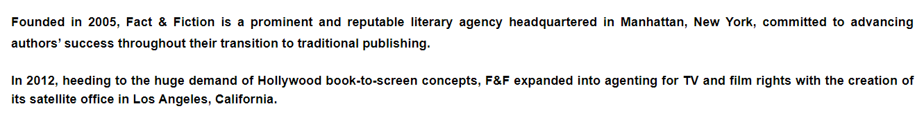 The instant I saw that last sentence, I knew I probably wasn’t dealing with a marginal-but-honest agency. Book-to-screen scams–where an unscrupulous operator cold-calls writers, claiming to be able to bring their books to Hollywood’s attention for enormous fees–are among the most common solicitations these days, now that the book fair display racket has become a non-starter due to the pandemic. Any time you see “book-to-screen”, warning bells should start to ring. (Another red flag: Fact & Fiction’s page for this supposedly robust program is…blank.)