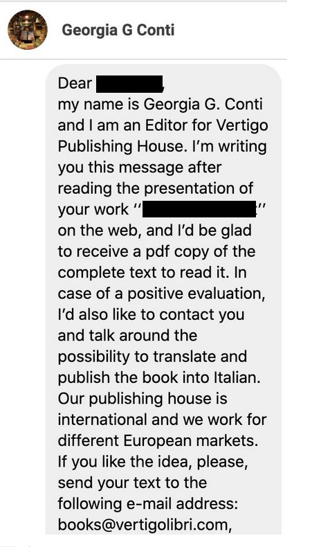 UPDATE 8/30/21: Looks like the word is getting out about Europe Books, and Albatros has taken note. I’m starting to hear about solicitations by sister imprint Vertigo Edizioni. Calling itself Vertigo Publishing House, the angle is a little different from the Europe Books solicitations: an offer to translate the writer’s book into Italian. Here’s the message one writer received via Facebook: