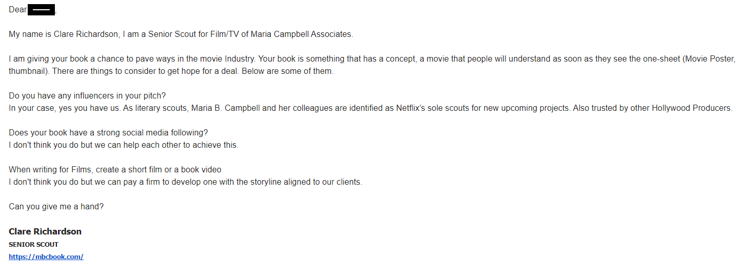This time, I’m breaking down a very similar scam that, capitalizing on the pandemic-fueled popularity of Netflix and other streaming services (as well as the eternal writerly dream of having one’s book translated into film), is appropriating the name of Clare Richardson, Senior Scout for film and TV at the New York office of Maria B. Campbell Associates, to hoodwink writers in an unusually complicated–and expensive–scheme.