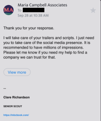 Warning signs abound. First, it’s Maria B. Campbell Associates, not Maria Campbell Associates (a small error, but it’s unlikely a real literary scout would get the name of their own agency wrong). Second, the scammer uses a gmail address (mariacampbellassociates@gmail.com), which not only is implausible for an agency with its own web domain, but doesn’t match the email address on the agency website (info@mbcbook.com). Third, not only are such out-of-the-blue approaches rare, a real literary scout won’t offer to act as your social media broker, or to hook you up with book video providers. That’s not what scouts do.
