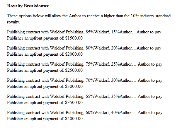 A couple of years ago I featured Waldorf Publishing in a post about a manuscript contest it was running, which was replete with red flags–not least of which is that Waldorf is a vanity publisher. At the time, it was charging a menu of fees, from which authors could pick and choose: