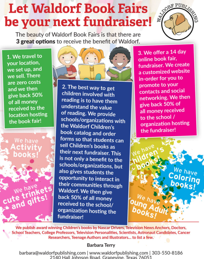 Recently the company has re-branded as Waldorf Publishing, Marketing and Public Relations–the marketing and PR being provided by Barbara Terry Public Relations Group, which promises MAXIMUM IMPACT without providing any examples to illustrate the claim (and no indication as to whether these new services entail extra cost for Waldorf authors). Ms. Terry has also started several spinoff businesses: Waldorf Bookstands LLC, which “provides books on spinner display stands to businesses all around the United States” and has no web presence other than a single mention on an investment website; Shaggy Pup, a distribution company focusing on “libraries and school curriculum” that also seems to be on pause (its Facebook page hasn’t been updated since January 2020, and clicking on its webpage URL produces a 403 Forbidden notice); and Waldorf Book Fairs, whose website is currently blank.