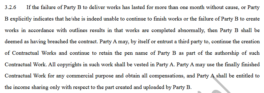 Furthermore, if that failure is “without cause”, or you confirm that you can’t finish, or you write “abnormally” (whatever that means) by failing to adhere to “outlines” (whatever those are), you are deemed to have breached the contract and NovelCat can simply take over the writing, and retain both copyright and income for such new writing, while still using your name as the author.
