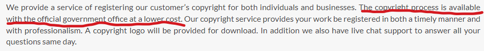This no doubt drives a lot of traffic Copyright Registration Online’s way, with many writers probably never realizing they aren’t dealing with an official branch of the US government, or realizing too late, despite this easily-missable small print on the home page:
