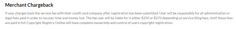 It’s pretty clear that Copyright Registration Online has had plenty of experience with dissatisfied customers–so much so that there’s an entire clause in its Terms and Conditions devoted to credit card chargebacks, with (probably unenforceable) financial penalties threatened against anyone who dares to initiate one:
