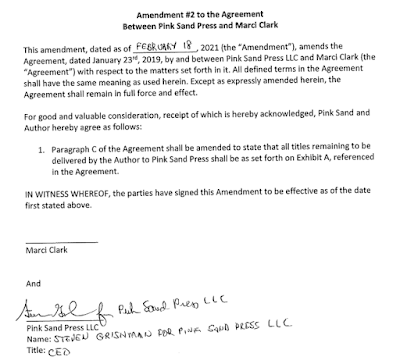 Make of that what you will. Make what you will, also, of the timelines involved. David Grishman incorporated RedRock Literary (for the first time) on November 13. Less than three weeks later, on December 2, he signed Clark as an agency client. Six weeks after that, on January 15, Steven Grishman incorporated Pink Sand Press. Clark’s publishing agreement was signed just eight days later, on January 23.