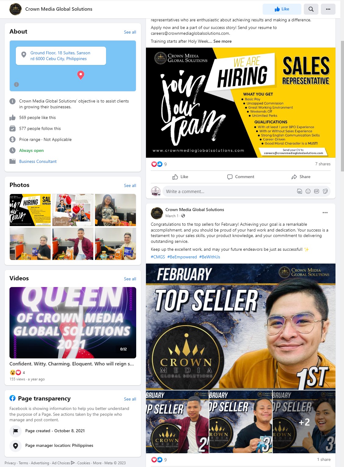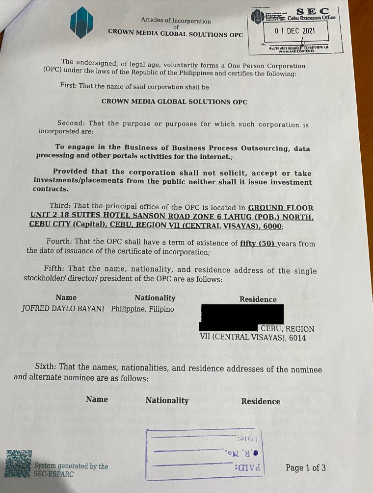 Now take a look at these Articles of Incorporation, applied for on December 1, 2021, for Crown Media Global Solutions OPC, a Philippine company that “engage[s] in the Business of Business Process Outsourcing, data processing and other portals activities for the internet”. (“Business outsourcing” is the bland term often adopted by Philippine companies that operate scams in the US and other countries.)